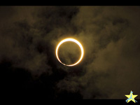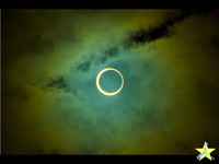 彩度の増感によって浮き出た金環日食の光冠。薄い雲の演出によって、幻想的な色彩の絵を得ることが出来た。