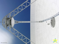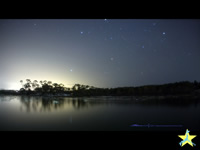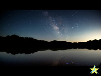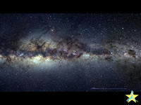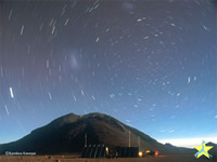 標高4800mのアタカマ大型ミリ波サブミリ波干渉計(ALMA)のサイト付近から望む南天の星空。画面中央に見えるチャスコン山の上に大小マゼラン銀河の光芒が見える。画面左の一番明るい星はカノープス。