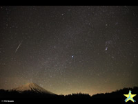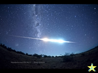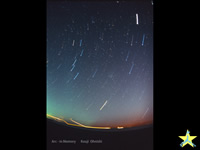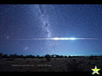「Hayabusa over the sky」 「はやぶさ」本体とカプセルは、右側より大気圏突入し、上空約100kmで、緑色に光り始めた。約70km付近で爆発的な発光、そして約60kmで破壊的な発光が起きた。 作者:大西浩次(天体写真家) 追加日:2011年4月26日 |
