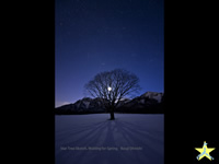 「天空の樹-Star Tree Sketch, Waiting for Spring」 3月の三日月は、北寄りに沈んでゆく。この月明かりが、木々の影を雪原のスクリーンに映しだしている。地上はまだ1m近い積雪だが、天空はすでに春へと移り変わっている。 作者:大西浩次(天体写真家) 追加日:2011年4月26日 |